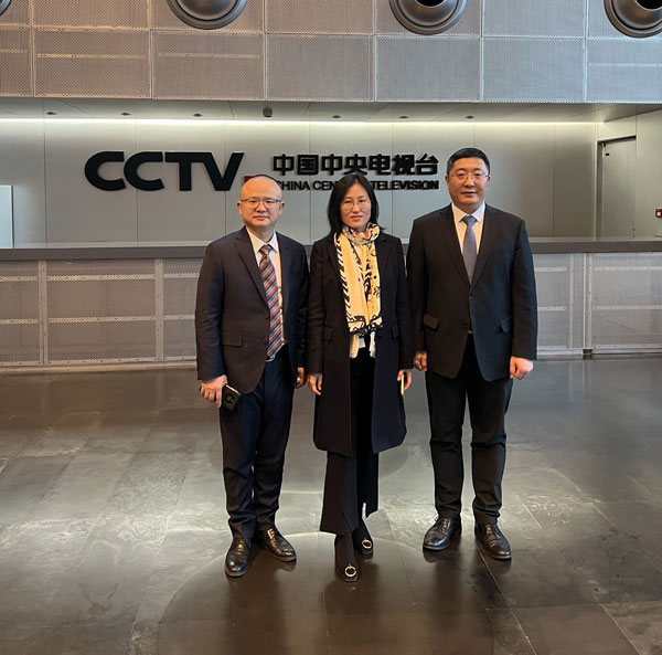 圖為質(zhì)檢協(xié)會副會長王群和會員協(xié)作發(fā)展中心主任劉輝、企業(yè)工作部主任王劍到訪中央電視臺