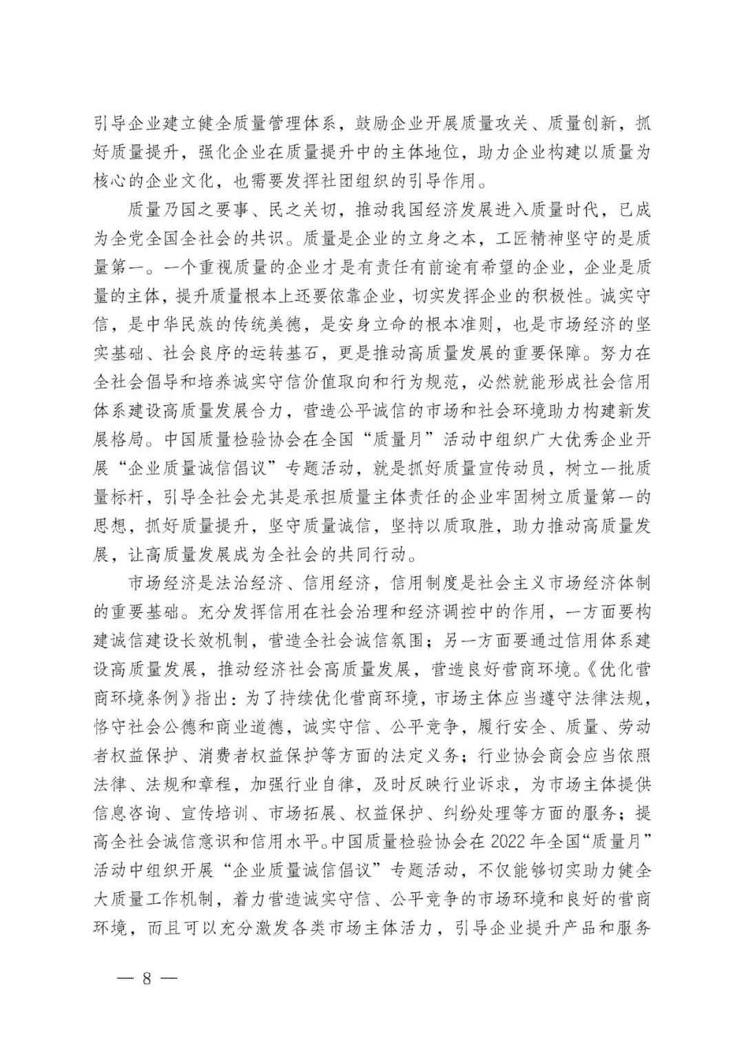 李克強(qiáng)總理批示指出,打造集質(zhì)量、標(biāo)準(zhǔn)、技術(shù)、品牌等于一體的高品質(zhì)產(chǎn)品和服務(wù),在市場(chǎng)競(jìng)爭(zhēng)中鍛就中國(guó)質(zhì)量、培育中國(guó)精品。倡導(dǎo)企業(yè)對(duì)產(chǎn)品和服務(wù)質(zhì)量作出誠(chéng)信倡議,也是中國(guó)質(zhì)量檢驗(yàn)協(xié)會(huì)自2004年以來(lái)組織開(kāi)展全國(guó)“質(zhì)量月”企業(yè)質(zhì)量誠(chéng)信倡議專題活動(dòng)的要義。謹(jǐn)期社會(huì)各界共同努力,推進(jìn)質(zhì)量社會(huì)共治,抓好產(chǎn)品和服務(wù)的高品質(zhì)質(zhì)量提升,共同為我們的質(zhì)量強(qiáng)國(guó)事業(yè)去奮斗!