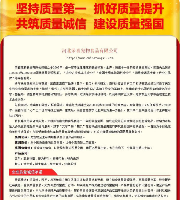 榮喜寵物食品有限公司創(chuàng)立于2002年,是一家專注健康寵物食品研發(fā)、生產(chǎn)、銷售于一體的寵物食品集團。自創(chuàng)立以來,一直堅持以寵物全生命周期提供高價值產(chǎn)品與服務(wù)為使命。