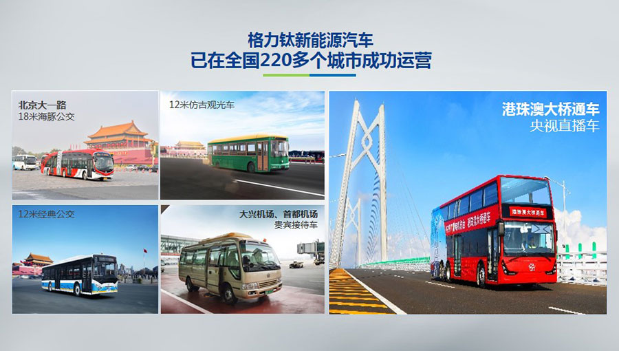 目前,格力鈦生產(chǎn)的新能源汽車于北京、杭州、武漢、青島、哈爾濱、包頭、??诘热珖?20多個城市運營。2014年,仿古鐺鐺車榮膺第22屆北京APEC會議官方指定用車、登陸北京環(huán)天安門旅游觀光線。2016年,雙層巴士榮膺第二屆中美低碳峰會指定用車、登陸國內(nèi)首條純電動雙層觀光車線路——北京城市旅游觀光3線。2017年,18米海豚公交車投入北京長安街1路運營。2018年,港珠澳大橋正式通車,雙層巴士擔綱中央廣播電視總臺直播車,成為首輛駛上港珠澳大橋的大巴車。