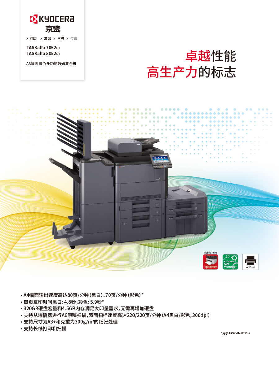 主要產(chǎn)品:KYOCERA京瓷激光打印機,一體機,復合機,生產(chǎn)型彩色噴墨數(shù)碼印刷系統(tǒng)及辦公信息系統(tǒng)的開發(fā)、設計、系統(tǒng)集成