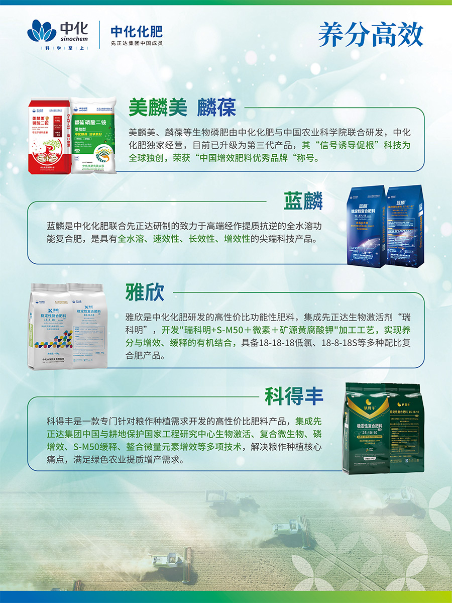 美麟美、麟葆等生物磷肥由中化化肥與中國(guó)農(nóng)業(yè)科學(xué)院聯(lián)合研發(fā),中化化肥獨(dú)家經(jīng)營(yíng),目前已升級(jí)為第三代產(chǎn)品,其“信號(hào)誘導(dǎo)促根”科技為全球獨(dú)創(chuàng),榮獲“中國(guó)增效肥料優(yōu)秀品牌“稱號(hào)藍(lán)麟是中化化肥聯(lián)合先正達(dá)研制的致力于高端經(jīng)作提質(zhì)抗逆的全水溶功能復(fù)合肥,是具有全水溶、速效性、長(zhǎng)效性、增效性的尖端科技產(chǎn)品。