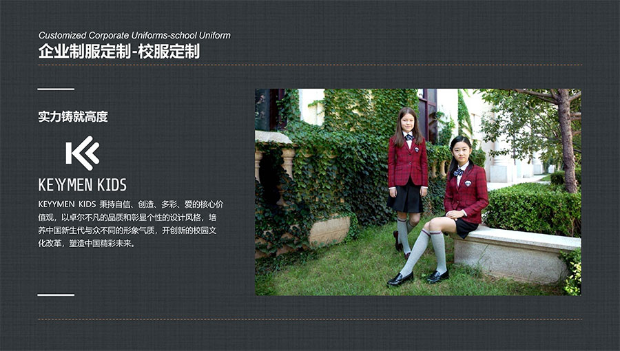 凱門學(xué)生裝(KEYYMEN KIDS)秉持自信、創(chuàng)造、多彩、愛(ài)的核心價(jià)值觀,堅(jiān)持“領(lǐng)先一步,步步領(lǐng)先”的品牌理念,致力于打造最具影響力的學(xué)生裝品牌,為中國(guó)青少年形象代言,以卓爾不凡的品質(zhì)和彰顯個(gè)性的設(shè)計(jì)風(fēng)格,培養(yǎng)中國(guó)青少年與眾不同的形象氣質(zhì)。