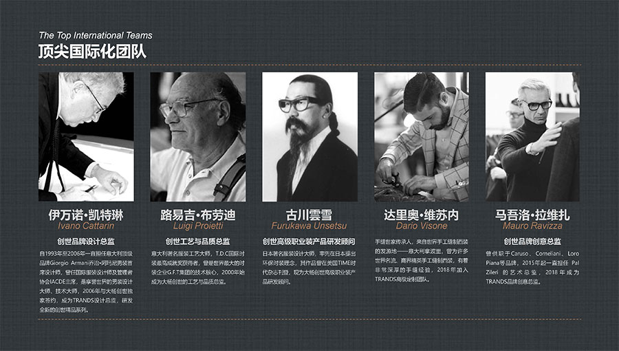 創(chuàng)世品牌(TRANDS):創(chuàng)建于1995年,是當(dāng)今中國(guó)高級(jí)男裝的代表品牌之一。TRANDS創(chuàng)世成衣產(chǎn)品及量身定制的西裝以其至臻品質(zhì)和精湛工藝,贏得眾多國(guó)際政商精英多年來(lái)的青睞。