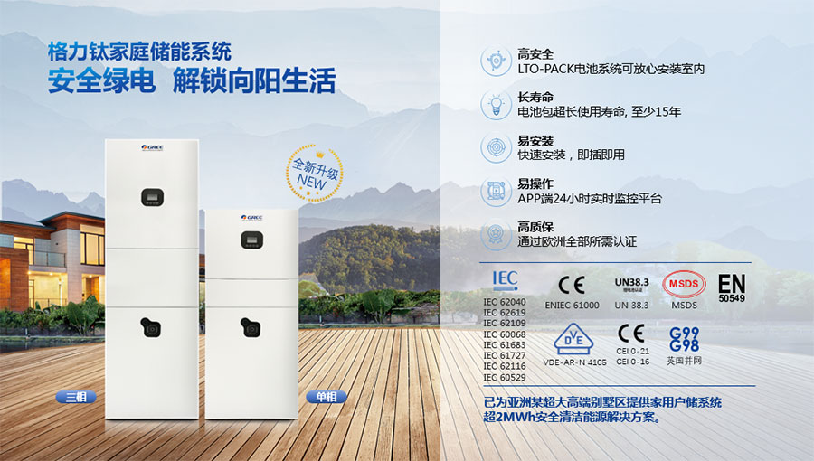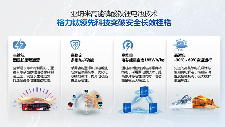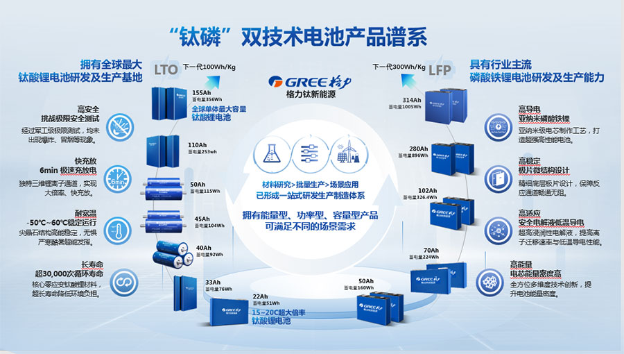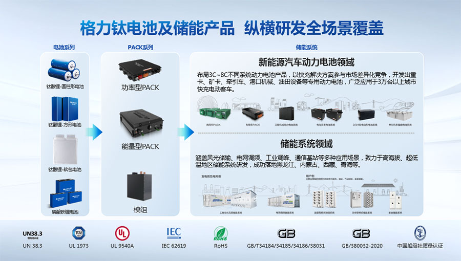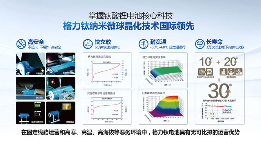 鈦酸鋰電池技術(shù)是新能源行業(yè)唯一獲得中國專利獎金獎的鋰電池產(chǎn)品技術(shù),其應(yīng)用于儲能電池和動力電池具有超高安全性,在快充放、耐寬溫、長壽命等方面同樣具有卓越的性能。格力鈦電池系列產(chǎn)品具有不起火不爆炸高安全、6分鐘快充放、-50℃至60℃耐寬溫特性,循環(huán)充放電次數(shù)高達(dá)30000多次,使用壽命長達(dá)30年。格力鈦電池經(jīng)利鋸切割、尖針穿刺、強(qiáng)力擠壓、電鉆沖孔、短路充放電、高溫加熱、槍擊等極限條件測試,均未發(fā)生冒煙、起火、燃燒、爆炸等現(xiàn)象。