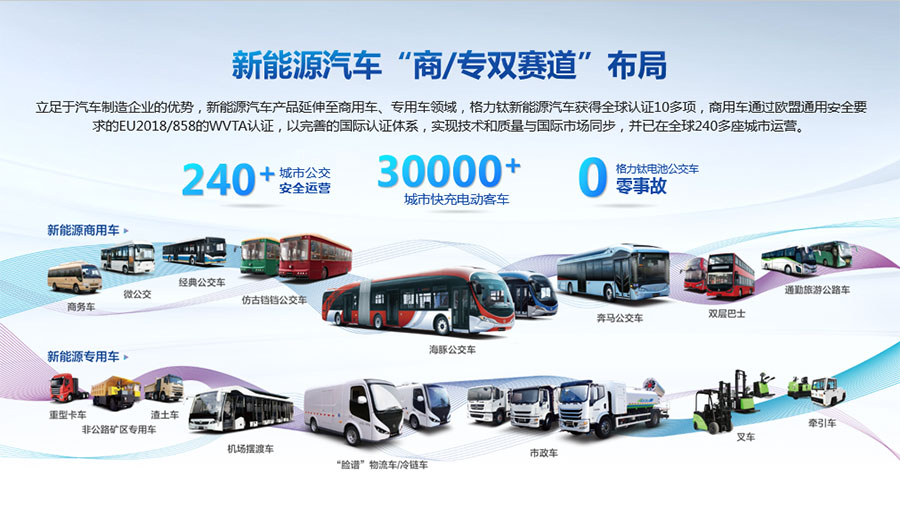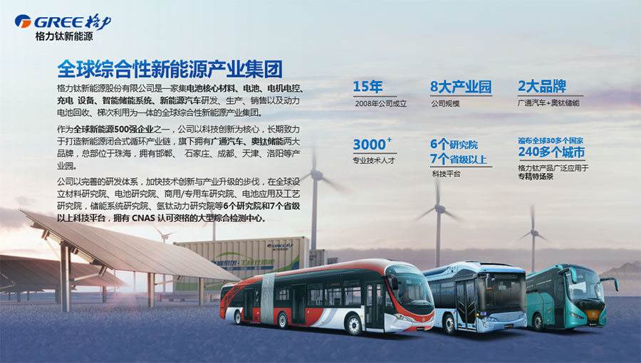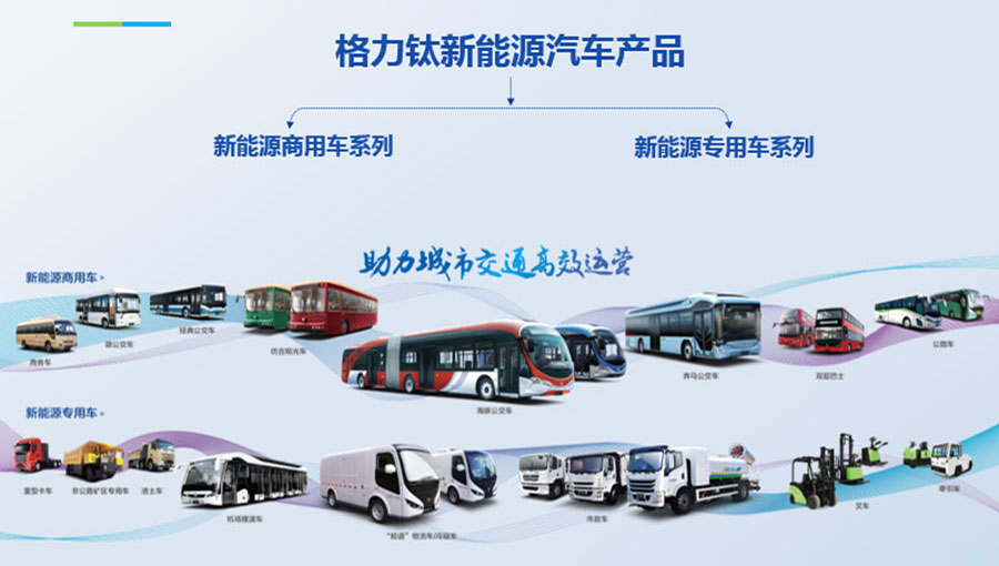 格力鈦新能源股份有限公司一直致力于研發(fā)混合動力、氫燃料、純電動車等一系列節(jié)能減排的新能源環(huán)保型客車/公交車/物流車,所研制產(chǎn)品體現(xiàn)了電子化、智能化、綠色化、節(jié)能化的鮮明特色,堅(jiān)持以產(chǎn)品開發(fā)和市場開拓相結(jié)合的經(jīng)營方針,引進(jìn)國外先進(jìn)客車生產(chǎn)技術(shù),力爭通過資本、技術(shù)及產(chǎn)業(yè)優(yōu)勢,做大區(qū)域市場,進(jìn)軍國際市場,力爭成為中國新能源汽車的領(lǐng)軍企業(yè)集團(tuán)。