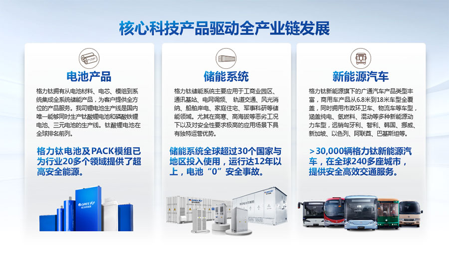 以完善的研發(fā)體系,公司加快技術(shù)創(chuàng)新與產(chǎn)業(yè)升級的步伐。公司研發(fā)的格力鈦電池安全性長期領(lǐng)跑行業(yè),憑借具有高安全、大倍率、快充放、耐寬溫、長壽命等特性,被選為“國家制造業(yè)單項(xiàng)冠軍產(chǎn)品”,廣泛應(yīng)用于新能源汽車以及工商業(yè)園區(qū)、通訊基站、電網(wǎng)調(diào)頻、軌道交通、風(fēng)光消納、船舶岸電、家庭住宅、軍事科研等儲能領(lǐng)域,具有廣闊的市場前景和應(yīng)用價值。目前,格力鈦儲能產(chǎn)品已在丹麥、瑞士、芬蘭等全球30多個國家和地區(qū)使用,新能源汽車產(chǎn)品在北京、杭州、武漢、成都、青島、哈爾濱、包頭、海口等全球240多座城市運(yùn)營,12年全球零電池事故安全運(yùn)行。