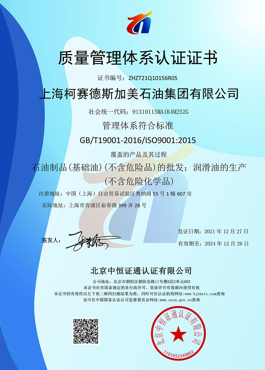 柯賽德斯集團(tuán)公司統(tǒng)一遵循嚴(yán)格的質(zhì)量保證體系,先后通過了武器裝備質(zhì)量管理體系認(rèn)證GJB9001C-2017、ISO/TS16949、IS09001質(zhì)量體系認(rèn)證、1S014001環(huán)境體系認(rèn)證及ISO45001:2018職業(yè)健康安全管理體系認(rèn)證。隨著業(yè)務(wù)領(lǐng)域的不斷擴(kuò)展,目前柯賽德斯集團(tuán)公司先后與多家世界能源、化工方面的巨頭建立了產(chǎn)品服務(wù)、供應(yīng)保障、技術(shù)合作、技術(shù)特別支持單位等方面的戰(zhàn)略合作關(guān)系。今天,柯賽德斯集團(tuán)旗下管理著三大潤(rùn)滑油品牌,實(shí)現(xiàn)了經(jīng)營(yíng)上的多元化戰(zhàn)略格局。