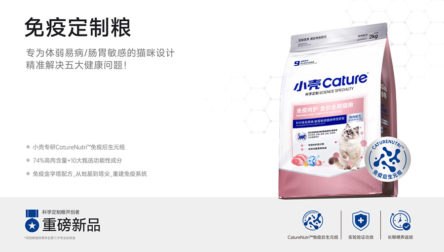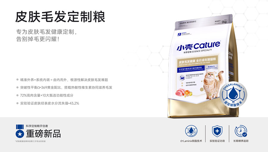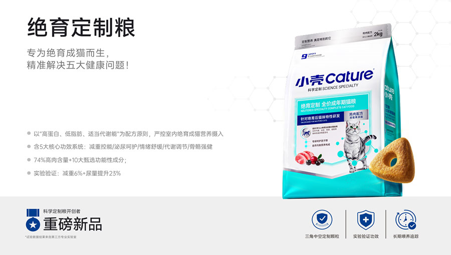 主要產品:小殼絕育定制糧,小殼皮膚毛發(fā)定制糧,小殼免疫呵護定制糧,小殼功能主食罐系列(小殼排毛主食罐,小殼魚油主食罐),小殼小輕松凍干棒系列(小殼貓草棒pro,小殼魚油棒pro)