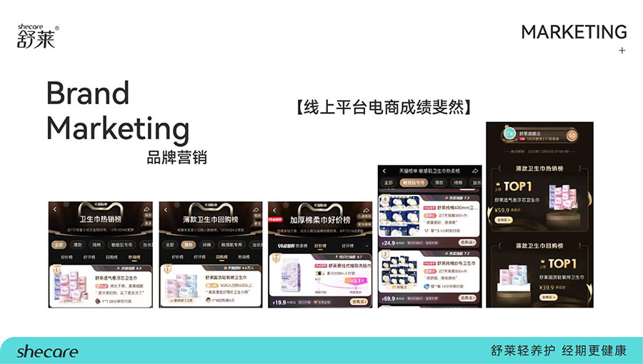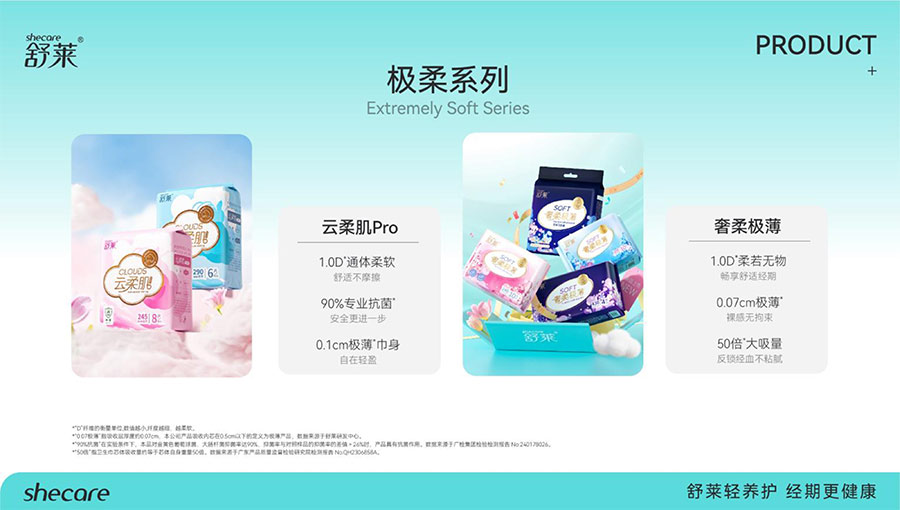 河南舒萊衛(wèi)生用品有限公司旗下?lián)碛惺嫒R、凸凸棉、純也、優(yōu)月季等品牌,產(chǎn)品涵蓋衛(wèi)生巾、安睡褲、護(hù)理液等品類。其中,舒萊品牌:S.H.E.CARE經(jīng)期健康管理體系,從科學(xué)、健康、舒適三大維度全方位呵護(hù)女性經(jīng)期健康。舒萊“輕養(yǎng)護(hù)”以漢方調(diào)養(yǎng)為根基,以科學(xué)抑護(hù)為本色,全方位調(diào)節(jié)女性經(jīng)期健康指數(shù),輕松實(shí)現(xiàn)經(jīng)期護(hù)理;凸凸棉品牌:獨(dú)創(chuàng)A.C.E.CARE品質(zhì)管理體系,以Air Tech干爽透氣、Comfort Tech舒適體感、Ecology Tech安全衛(wèi)生為核心,打造更懂女性的護(hù)理體驗(yàn)。