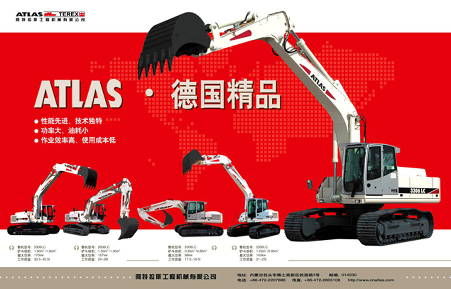 中國阿特拉斯是高新技術企業(yè),主要生產和銷售具有世界先進水平的ATLAS 20噸級以上中大型及礦用挖掘機。該系列挖掘機具有“性能先進、技術獨特;功率大、油耗小;作業(yè)效率高、使用成本低”的突出特點,可廣泛應用于礦山開采及城鄉(xiāng)建設。