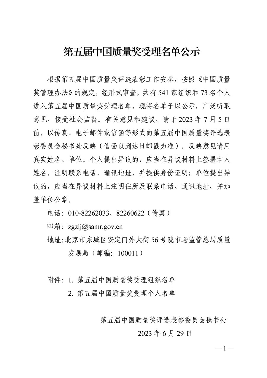 據(jù)悉,有關(guān)意見(jiàn)和建議可于 2023 年 7 月 5 日前,以傳真、電子郵件或信函等形式向第五屆中國(guó)質(zhì)量獎(jiǎng)評(píng)選表彰委員會(huì)秘書(shū)處反映(信函以到達(dá)日郵戳為準(zhǔn))。反映意見(jiàn)應(yīng)當(dāng)用真實(shí)姓名、單位。個(gè)人提出異議的,應(yīng)當(dāng)在異議材料上簽署本人姓名,注明聯(lián)系電話(huà)、通訊地址,并提供身份證明;單位提出異 議的,應(yīng)當(dāng)在異議材料上注明住所及聯(lián)系電話(huà)、通訊地址,并加蓋單位公章。