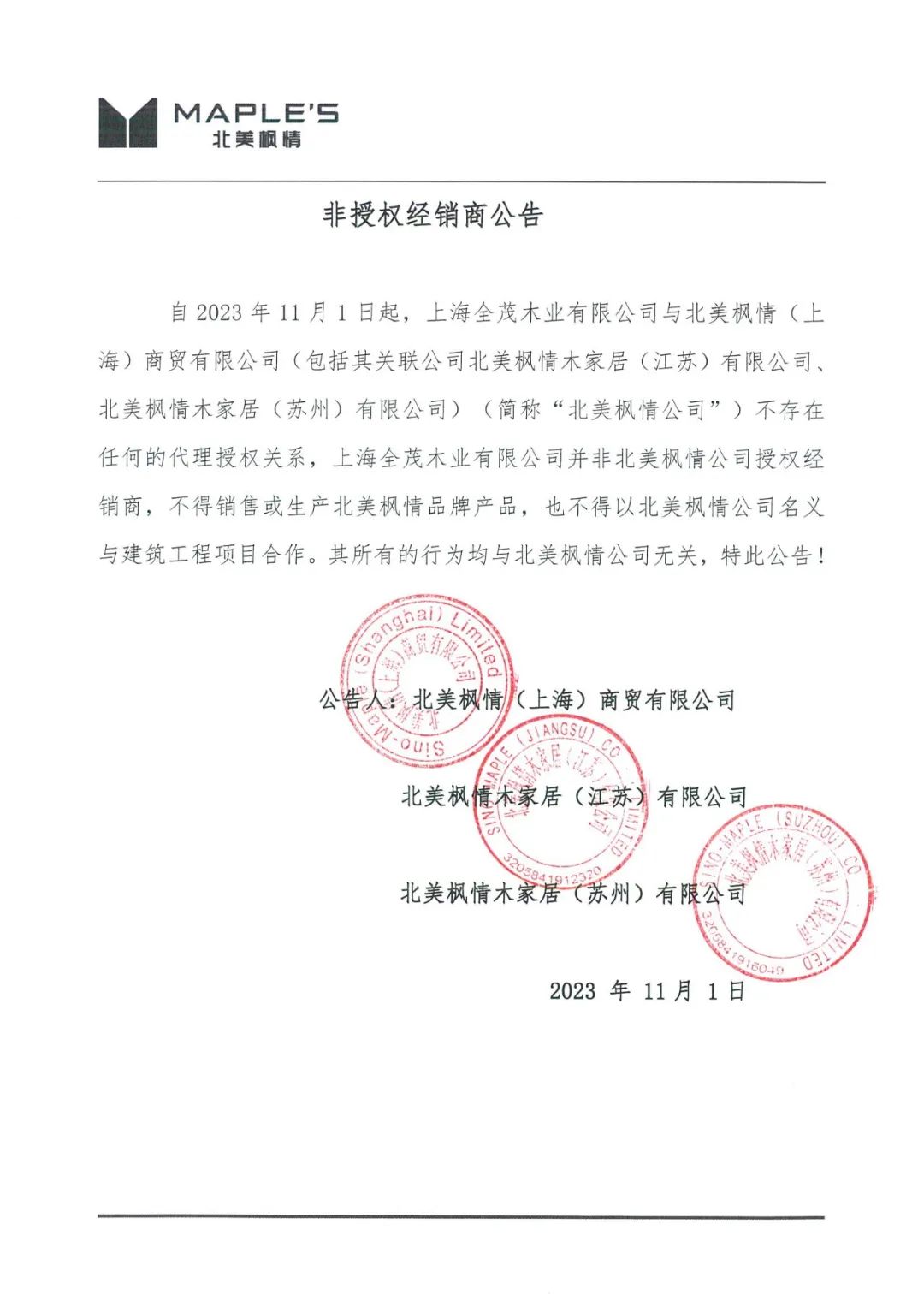 自2023年11月1日起,上海全茂木業(yè)有限公司與北美楓情 (上海)商貿(mào)有限公司(包括其關(guān)聯(lián)公司北美楓情木家居(江蘇)有限公司、北美楓情木家居(蘇州)有限公司)(《簡(jiǎn)稱“北美楓情公司”)不存在任何的代理授權(quán)關(guān)系,上海全茂木業(yè)有限公司并非北美楓情公司授權(quán)經(jīng)銷商,不得銷售或生產(chǎn)北美楓情品牌產(chǎn)品,也不得以北美楓情公司名義與建筑工程項(xiàng)目合作。其所有的行為均與北美楓情公司無關(guān),特此公告!
