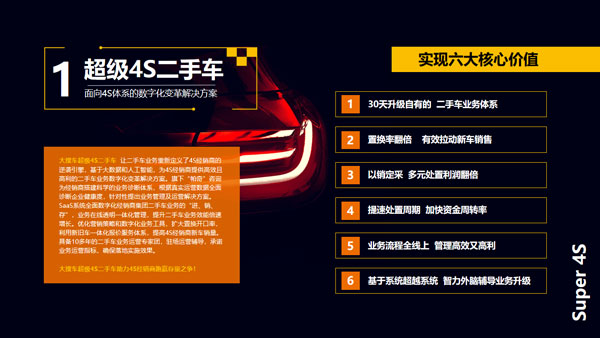 多年來,268V檢測系統(tǒng)已經(jīng)在全國經(jīng)銷商中普及,累計(jì)檢測數(shù)百萬車輛。如今,該系統(tǒng)進(jìn)一步融入云計(jì)算、人工智能、圖像識(shí)別、語音識(shí)別等先進(jìn)技術(shù),可以實(shí)現(xiàn)全程無人化和更高的檢測效率與精準(zhǔn)度。在此基礎(chǔ)上,車易拍聚合大搜車的SaaS能力和自身的交易拍賣能力,推出了超級(jí)4S二手車這一數(shù)字化變革解決方案,通過對(duì)進(jìn)、銷、存、管的全面數(shù)字化,有效推動(dòng)經(jīng)銷商內(nèi)部工作流程的規(guī)范化和提升運(yùn)營效率。