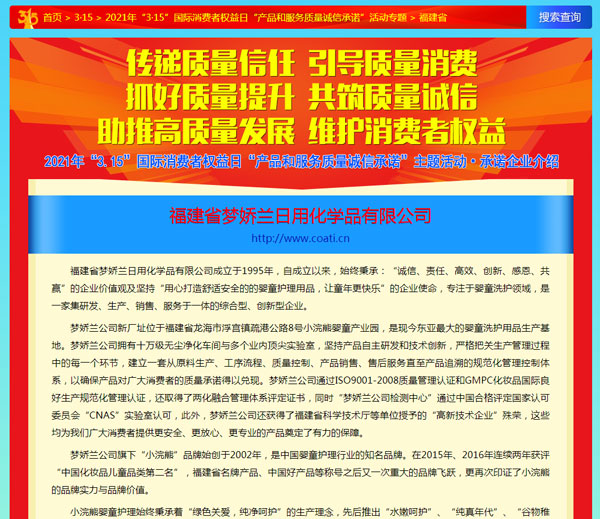 引導(dǎo)質(zhì)量消費,共筑質(zhì)量誠信,3月15日,由中國質(zhì)量檢驗協(xié)會主辦的2021年“3.15”產(chǎn)品和服務(wù)質(zhì)量誠信承諾的主題活動如期舉行,小浣熊作為“3.15”產(chǎn)品和服務(wù)質(zhì)量誠信承諾企業(yè),憑借匠心的品質(zhì)、優(yōu)質(zhì)的服務(wù)及良好的口碑,獲得協(xié)會以及權(quán)威專家的一致認可,榮獲“全國產(chǎn)品和服務(wù)質(zhì)量誠信示范企業(yè)”,“全國質(zhì)量誠信先進企業(yè)”、“全國質(zhì)量信譽保障產(chǎn)品”、“全國日化行業(yè)質(zhì)量領(lǐng)先品牌” 等多項榮譽,《中國質(zhì)量報》、《中國消費者報》及中國質(zhì)量網(wǎng)、中國經(jīng)濟網(wǎng)、中國消費網(wǎng)等多家媒體均予以集中展示和公告。