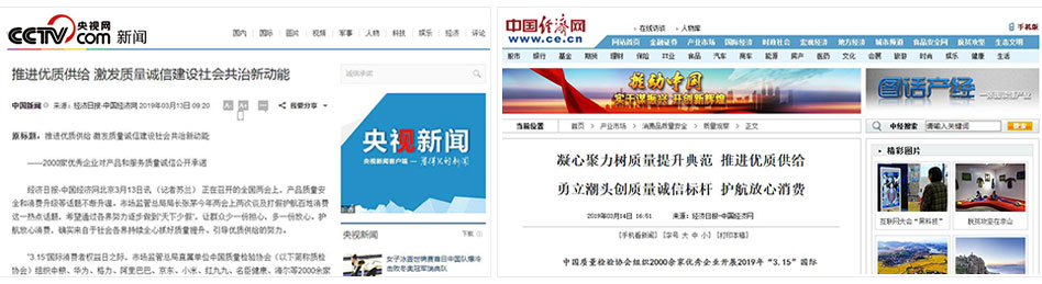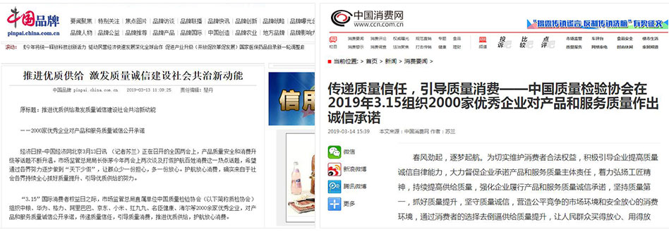•中國消費網(wǎng)《傳遞質(zhì)量信任,引導(dǎo)質(zhì)量消費——中國質(zhì)量檢驗協(xié)會在2019年3.15組織2000家優(yōu)秀企業(yè)對產(chǎn)品和服務(wù)質(zhì)量作出誠信承諾》