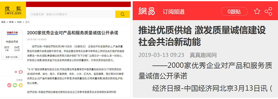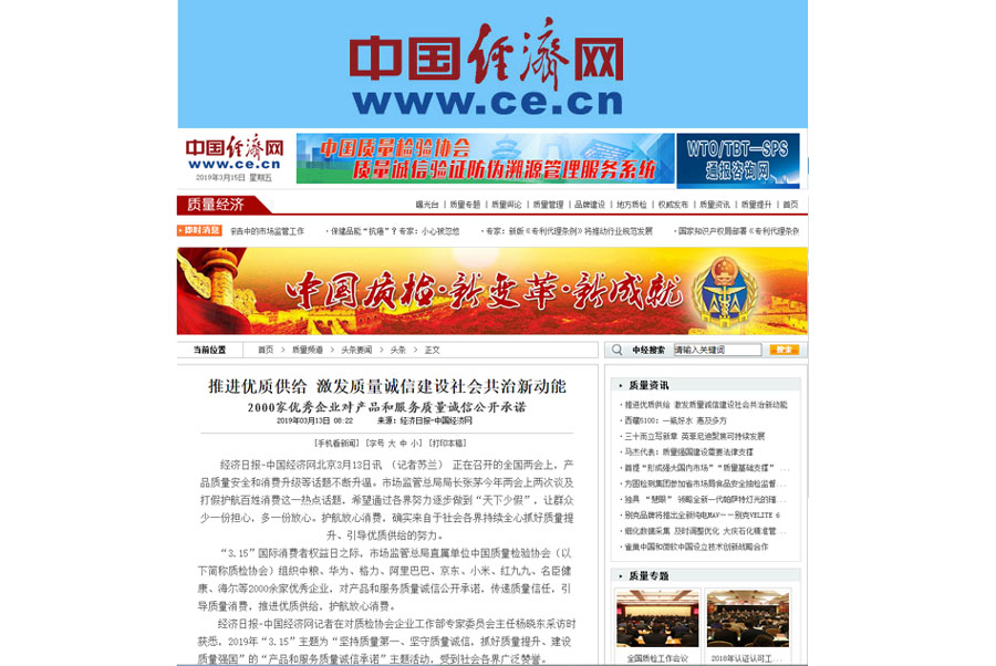 •中國經(jīng)濟網(wǎng)《推進優(yōu)質(zhì)供給 激發(fā)質(zhì)量誠信建設(shè)社會共治新動能 2000家優(yōu)秀企業(yè)對產(chǎn)品和服務(wù)質(zhì)量誠信公開承諾》