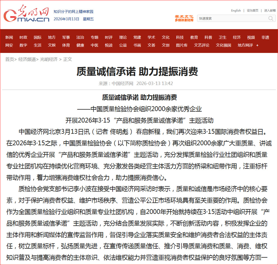 光明網報道:質量誠信承諾 助力提振消費——中國質量檢驗協(xié)會組織2000余家優(yōu)秀企業(yè)開展2026年3·15“產品和服務質量誠信承諾”主題活動