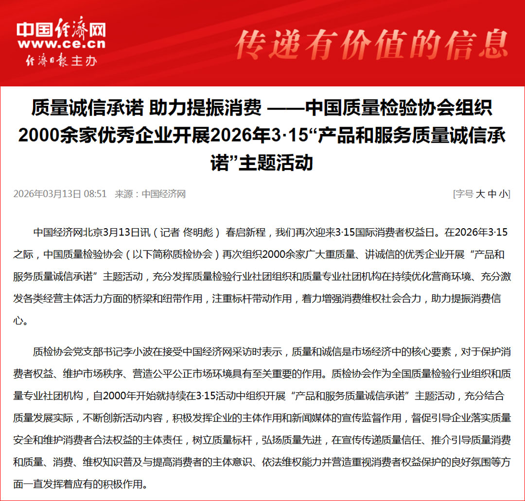 中國經濟網發(fā)布:質量誠信承諾 助力提振消費——中國質量檢驗協(xié)會組織2000余家優(yōu)秀企業(yè)開展2026年3·15“產品和服務質量誠信承諾”主題活動