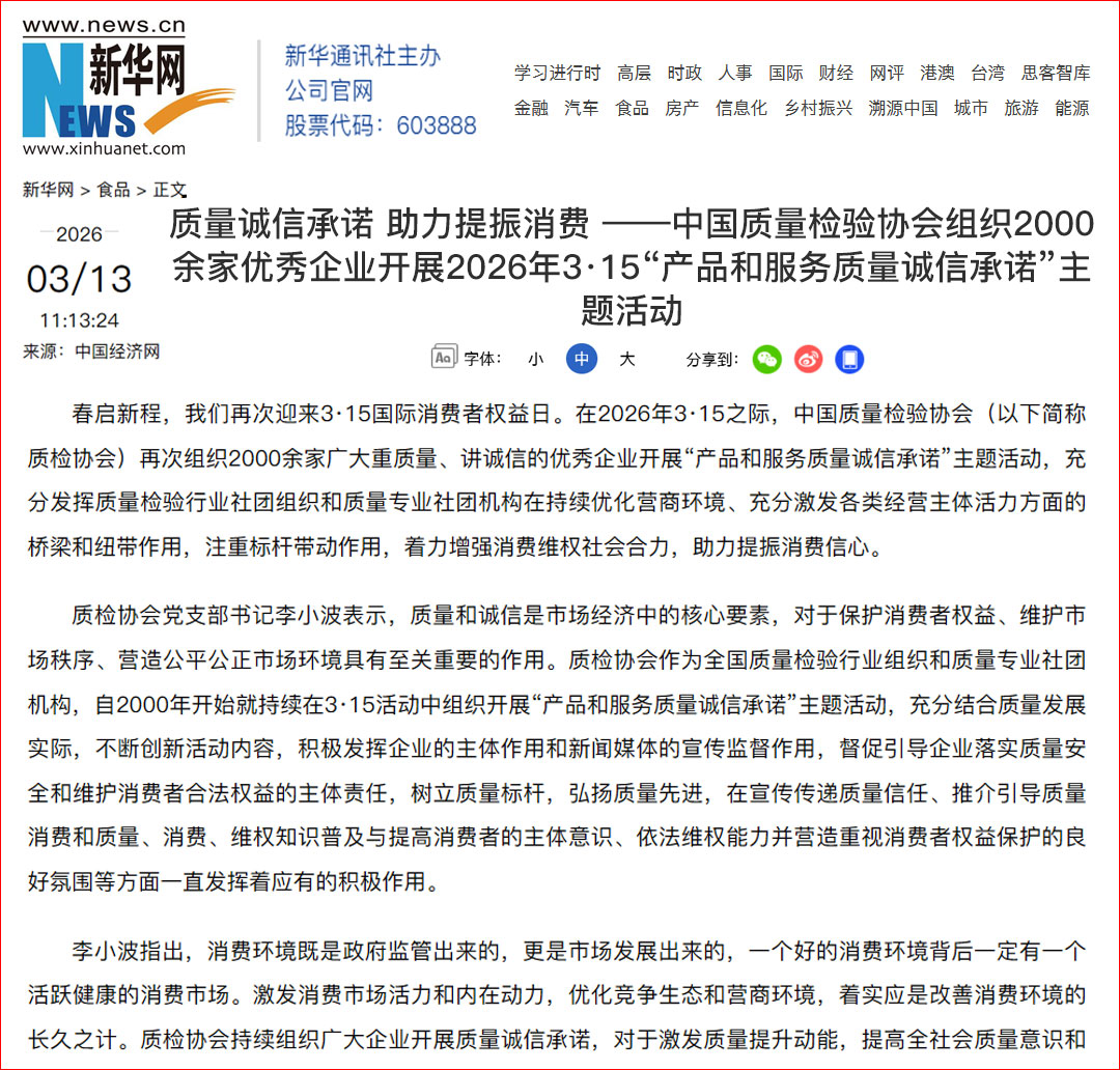 新華網報道:質量誠信承諾 助力提振消費——中國質量檢驗協(xié)會組織2000余家優(yōu)秀企業(yè)開展2026年3·15“產品和服務質量誠信承諾”主題活動