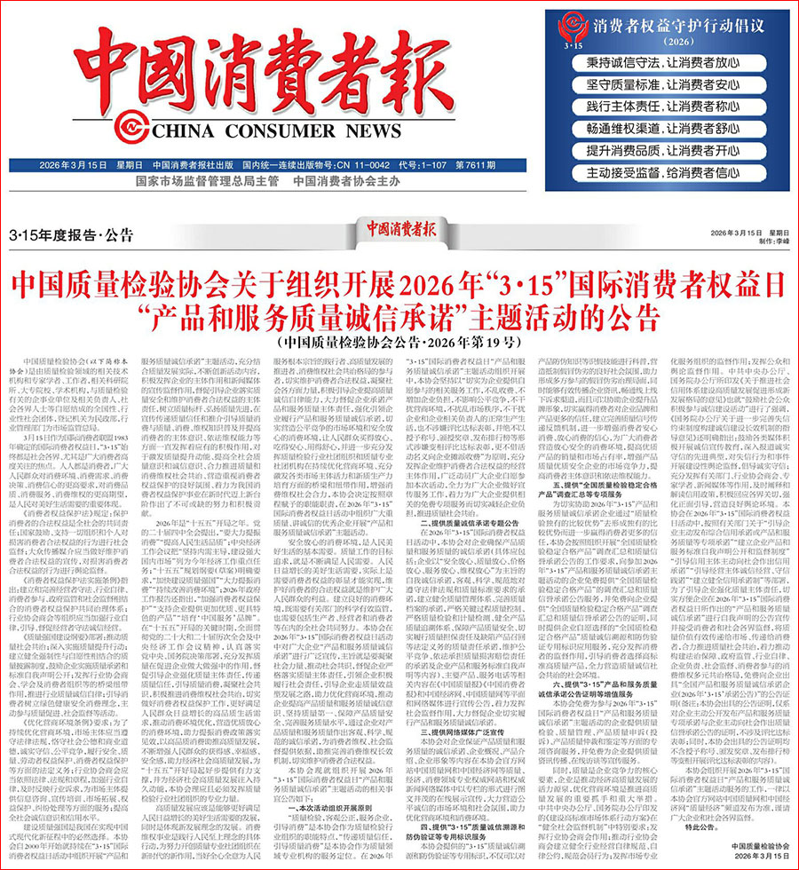《中國消費者報》(2026年3月15日刊)發(fā)布:中國質量檢驗協(xié)會關于組織開展全國質量檢驗穩(wěn)定合格產品(2023-2026年度)調查匯總和質量信譽承諾公告宣傳工作的公告(中國質量檢驗協(xié)會公告·2026年第3號)